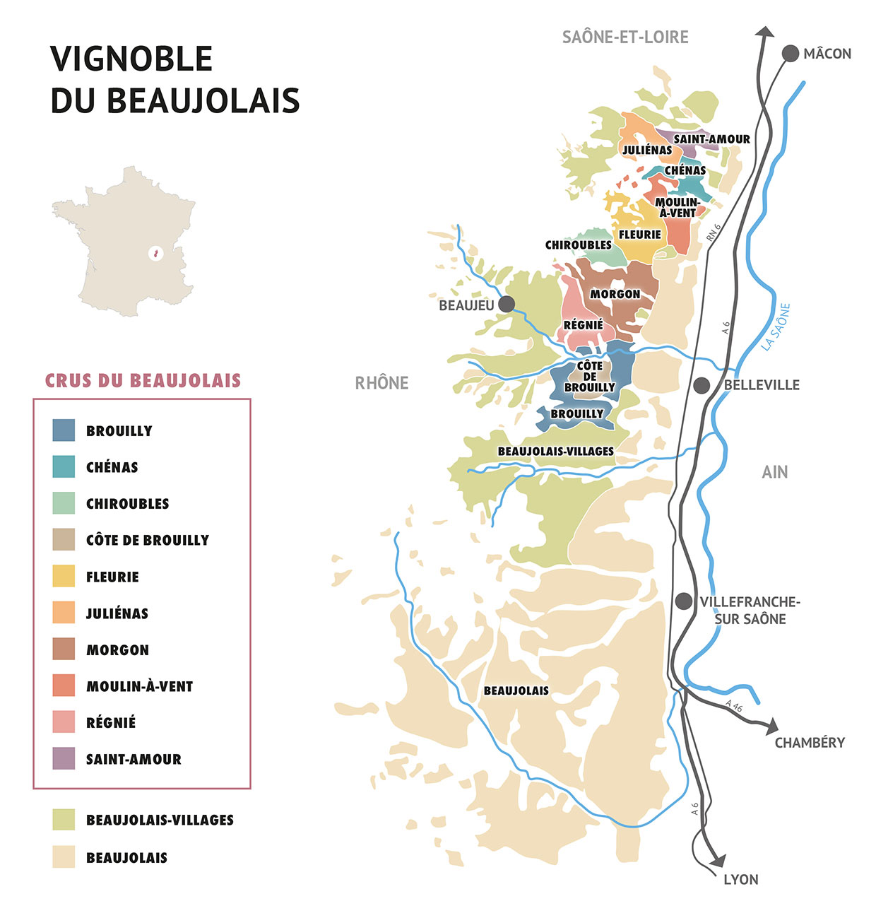 L’appellation Beaujolais est produite essentiellement dans la région sud de Villefranche-sur-Saône. Le vignoble s'étend sur 9 700 hectares.